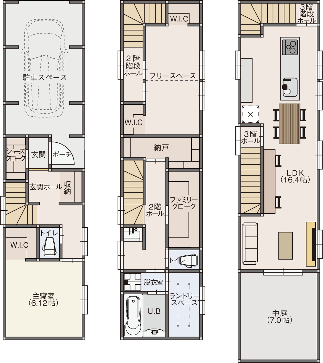3 階に中庭リビングのある家!採光を工夫してどの部屋も明るく。狭小地でも広々快適に過ごせます
