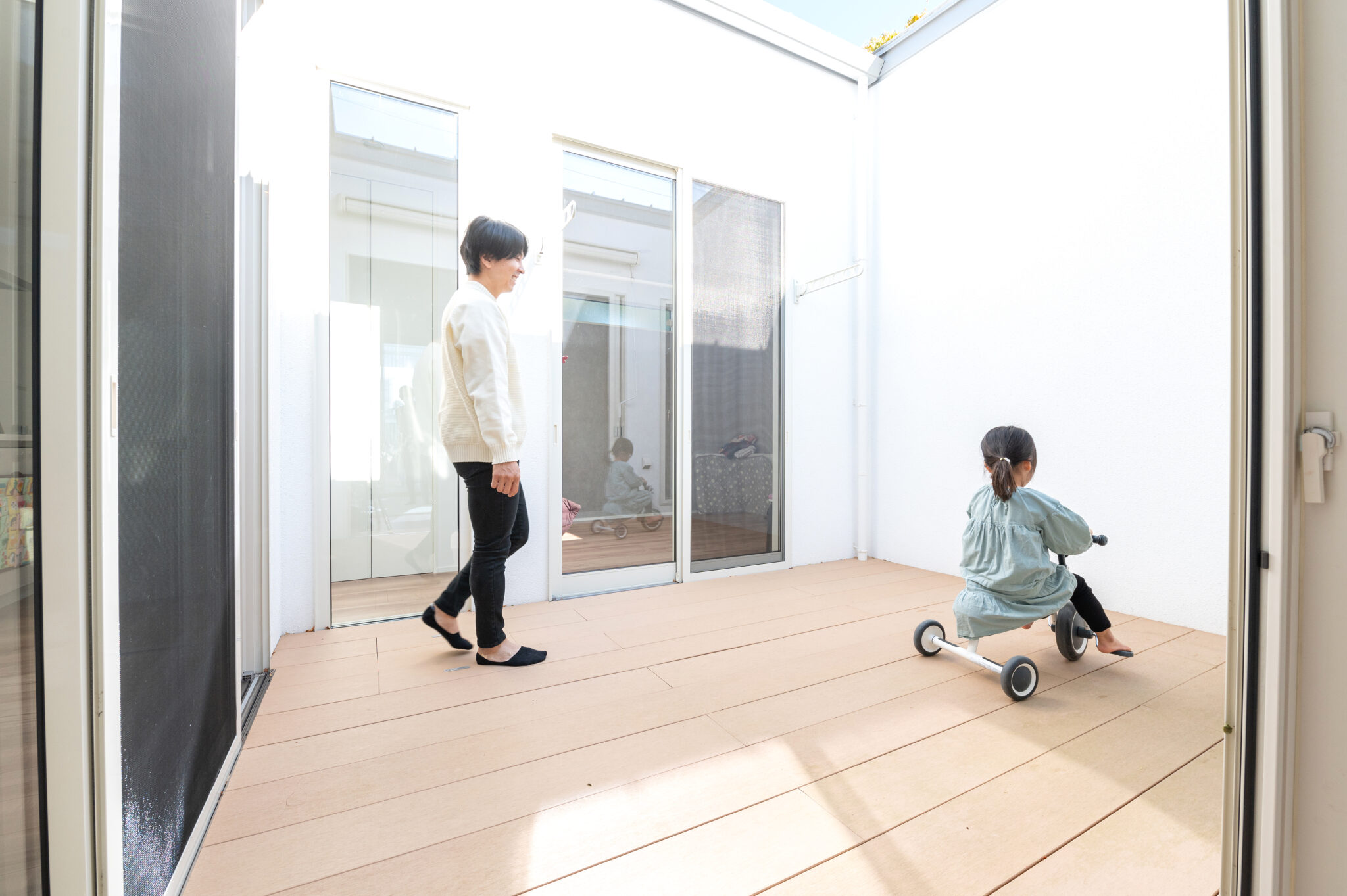 中庭では、週末にバーベキューなども頻繁に開くといいます。また、リビングから子どもが中庭で遊んでいるところを見守れるため、安心感があり、ご夫婦にも好評です。 旦那様は、「子どもは伸び伸び育っていますよ、走り回ったりして。私も子どもとよく一緒に走り回るんですよ。広々としているので、ほんとうにスピード出したりとかできるんですよ」とご主人も笑顔になります。家の外側のこだわりポイントとしては、雨どいなどが外からは見えないよう、内側に配置してあるところ。