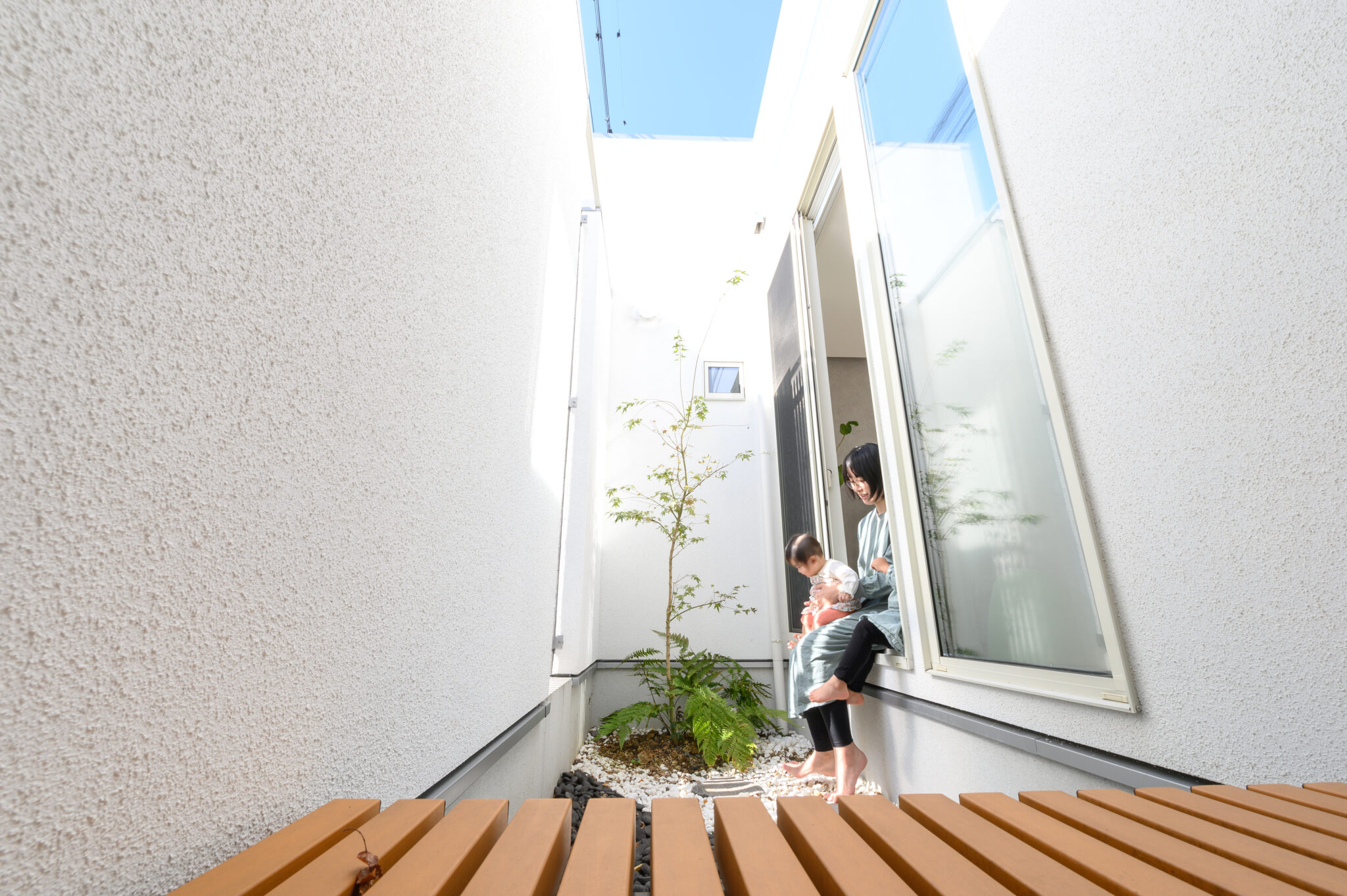 • 坪庭/ デッキやリビングのはきだし窓から降りることができる、坪庭。明るい日が降り注ぎ、アクセントを与える植栽の樹木は、お子様とともに成長も楽しめる。