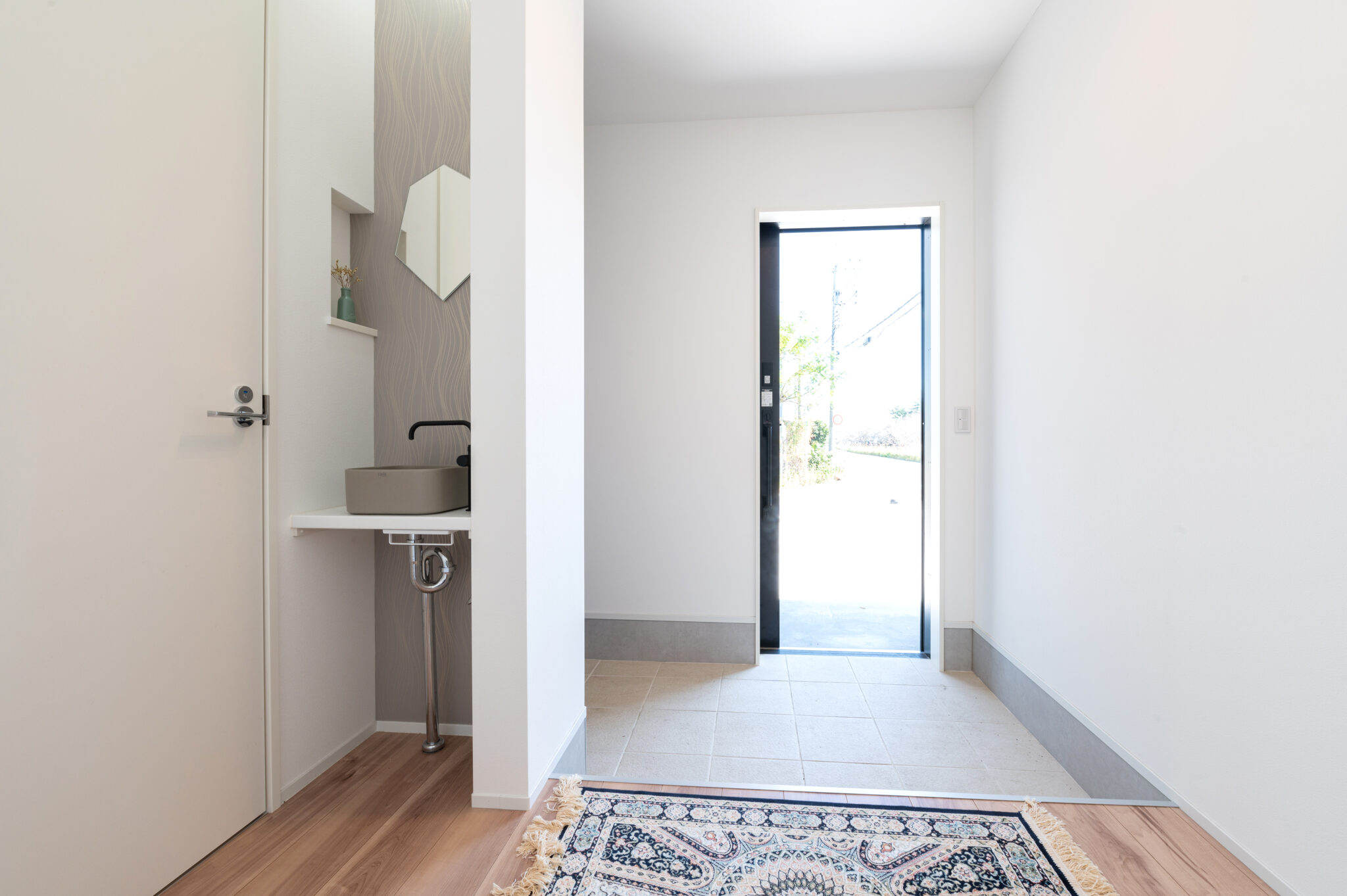 • 玄関スペース/ たたきに上がってすぐ横には造作の手洗い場を設置したので、コロナ禍にあっても衛星管理はばっちり。むき出しの配管が、かえってオシャレな雰囲気を醸し出す。